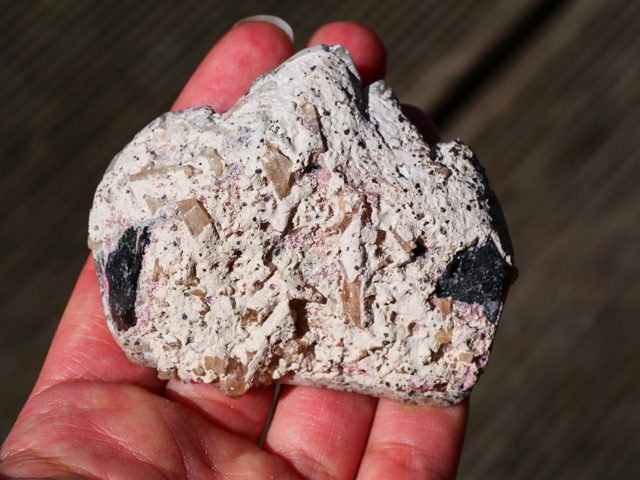 Velký počet medově žlutých krystalů danburitu na oboustranně ukončeném multikrystalu záhnědy. Nejdelší krystal danburitu na pohledové straně měří 36 mm. Tento starý vzorek doplňují drobné náteky tvořené jemnými krystaly rubelitu.
