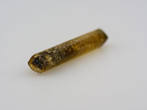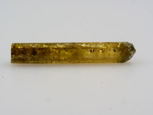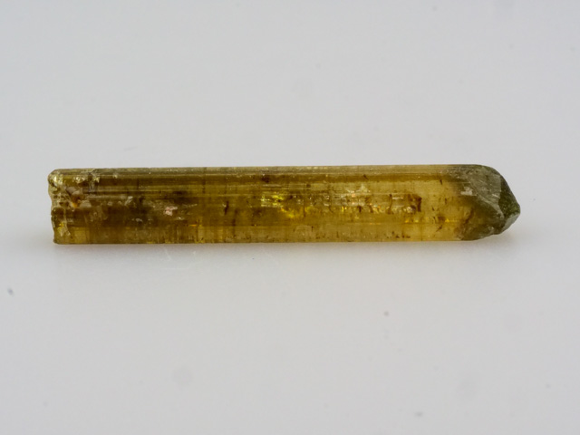 Krystal zeleného dravitu z lokality Mwajanga v Tanzánii. Ukončený krystal zeleného turmalínu se zonálním zbarvením. Bez prosvícení se jeví více tmavý než jak je zachyceno na fotkách z fotostudia.