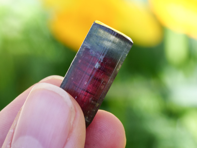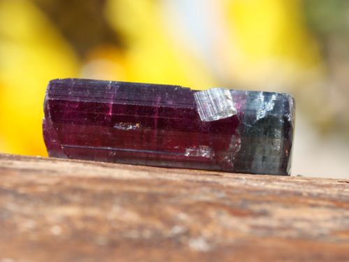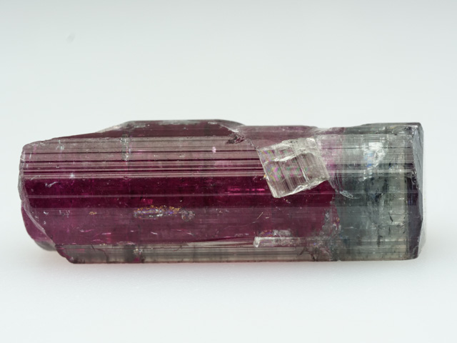 Ukončený sloupečkovitý krystal turmalínu z brazilské lokality Cruzeiro mine. Krystal má sytě růžové jádro a 5,5 mm široukou vrstvu modrozelené barvy pod ukončením (tzv. vodní meloun).Na boční straně drobné kontakty a jedno setření o velikosti 1,5x2mm. Krásný estetický vzorek.