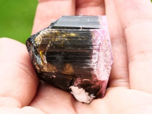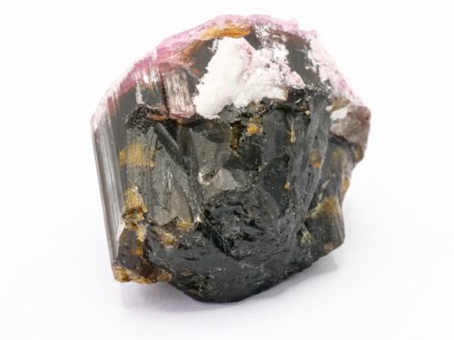 Ukončený, nízce sloupečkovitý krystal elbaitu. Ukončení krystalu je malinově růžové, hlavní část krystalu má barvu žlutohnědou, uvnitř poměrně čistý kámen.