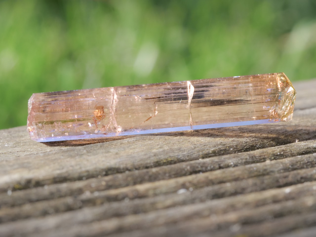 Dlouze sloupečkovitý krystal růžového turmalínu s nezelenalým ukončením. Spodní část krystalu byla dolepena, v horních dvou třetinách je přirozená stabilní prasklina - nelepené. Velmi čistý turmalín.