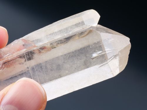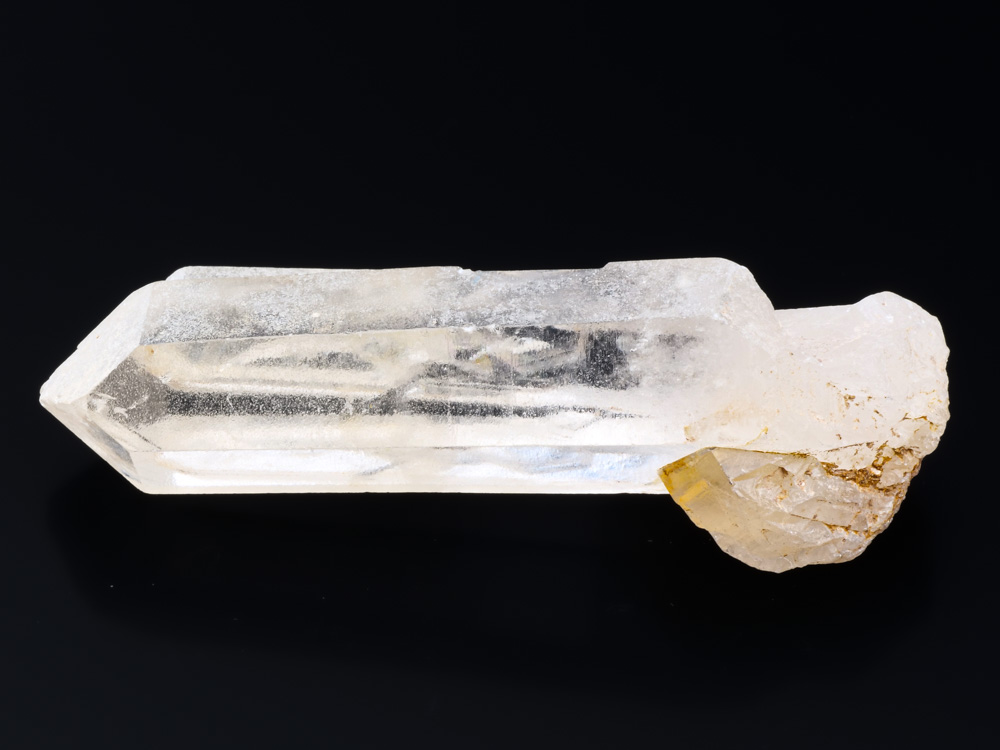 Dvojkrystal velmi čistého křišťálu z lokality Sava na Madagaskaru. Oba krystaly mají drobné poškození v ukončení (5,5x3 mm a 4x1,5 mm).