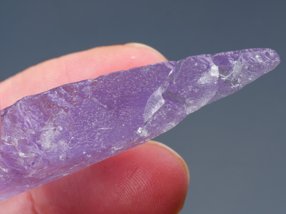 Hezký ukončený krystal kunzitu z pegmatitového pole Mawi. Krystal má příjemně růžovou barvu a velmi vysokou čistotu. Kámen vhodný k dalšímu zpracování. Nejvíc vystihuje zbarvení kamene video natočené na dením světle. Video je zde.