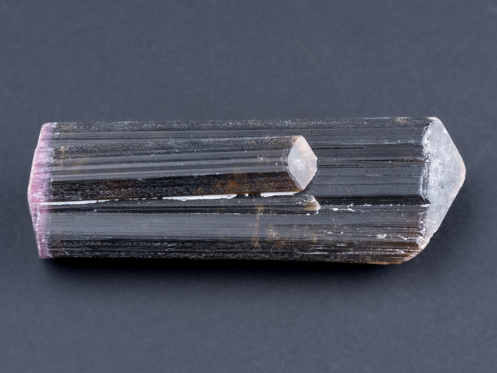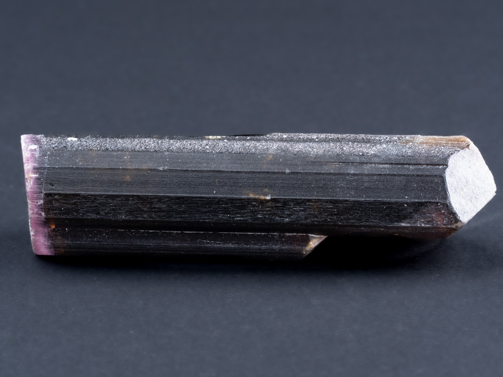 Oboustranně ukončený krystal liddicoatitu z lokality Malkhan v Rusku. Barevně vzorek přechází přes různé žlutohnědé tóny, až do sytě růžové, 4 mm mocné vrsty jednoho z ukončení. Vzhledem k situaci v Rusku se jedná o jistojistě investiční vzorek.