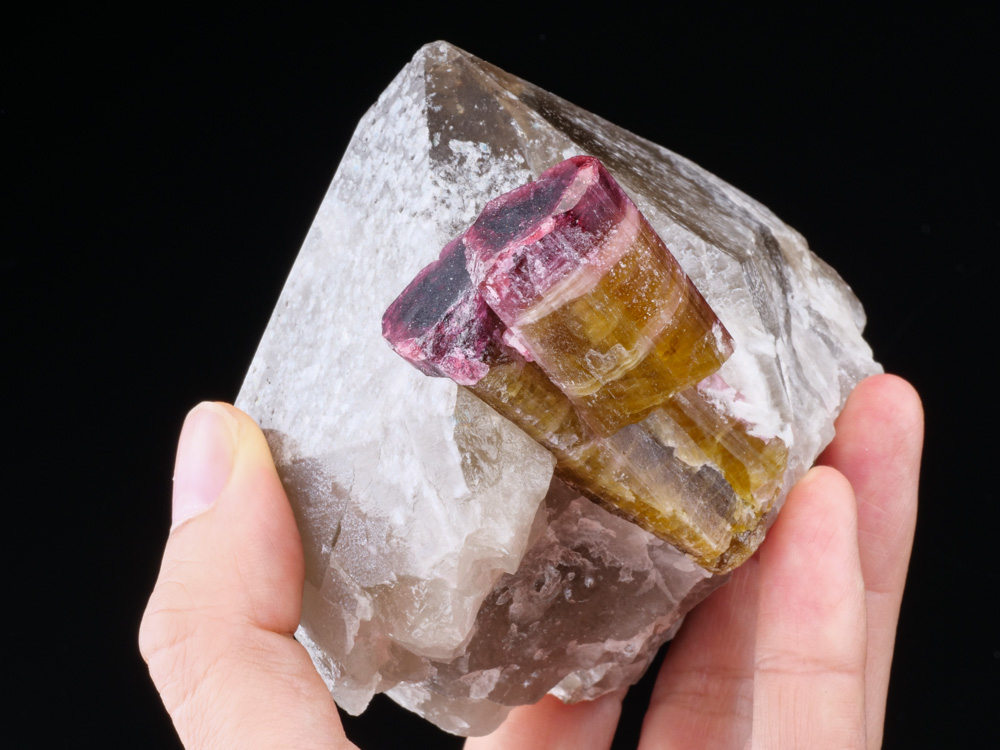 Dva ukončené krystaly liddicoatitu na podložce tvořený velkým krystalem záhnědy z lokality Malkhan v Rusku. Menší z krystalů byl odlomen a rozdělen do dvou dílů. U vzorku proběhla zdařilá rekonstrukce a Vy tak můžete získat nadstandartně kvalitní vzorek za dumpingovou cenu.