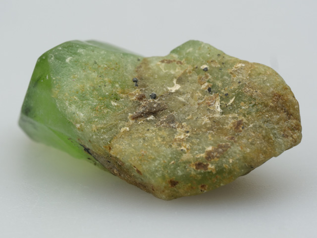 Krystal olivínu (peridotu) z lokality Suppat v Pakistánu. Krystal je sytě olivově zelené barvy a ve vrstvě těsně pod porvrchem má inkluze ludwigitu. Krystal je z jedné strany ukočený, ze strany druhé má kontakt.