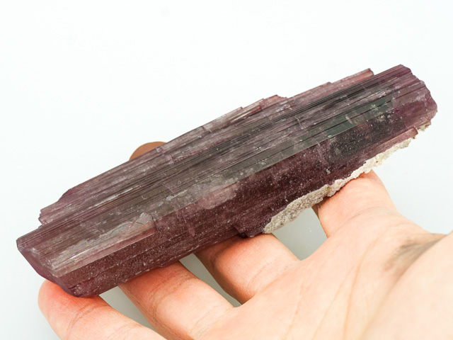 Ukončený krystal rubelitu z ruské lokality Malkhan. Spodní část (3 cm) krystalu byla zpět dolepena. Profesionální oprava kamene není téměř patrná. Zadní strana pokrytá z jedné poloviny bílými zeolity.