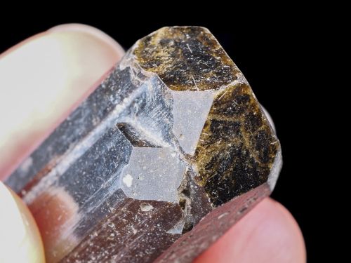 Ukončený lesklý krystal z lokality Malkhan. Hnědozelený povrch o tloušťce 1,5 - 3 mm obepíná sytě růžové jádro. Jedná se o tzv. vodní meloun. Nepoškozený vzorek ze starých sběrů.