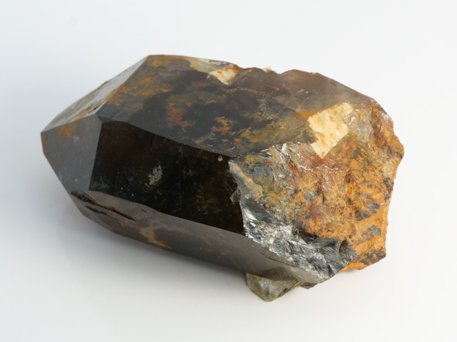 Monokrystal krystal velmi čisté záhnědy z lokality Suky. Krystal je částečně pokrytý jemnou vrstvičkou oxidu železa. V podstatě nepoškozený vzorek s drobnou slídou na boční straně.