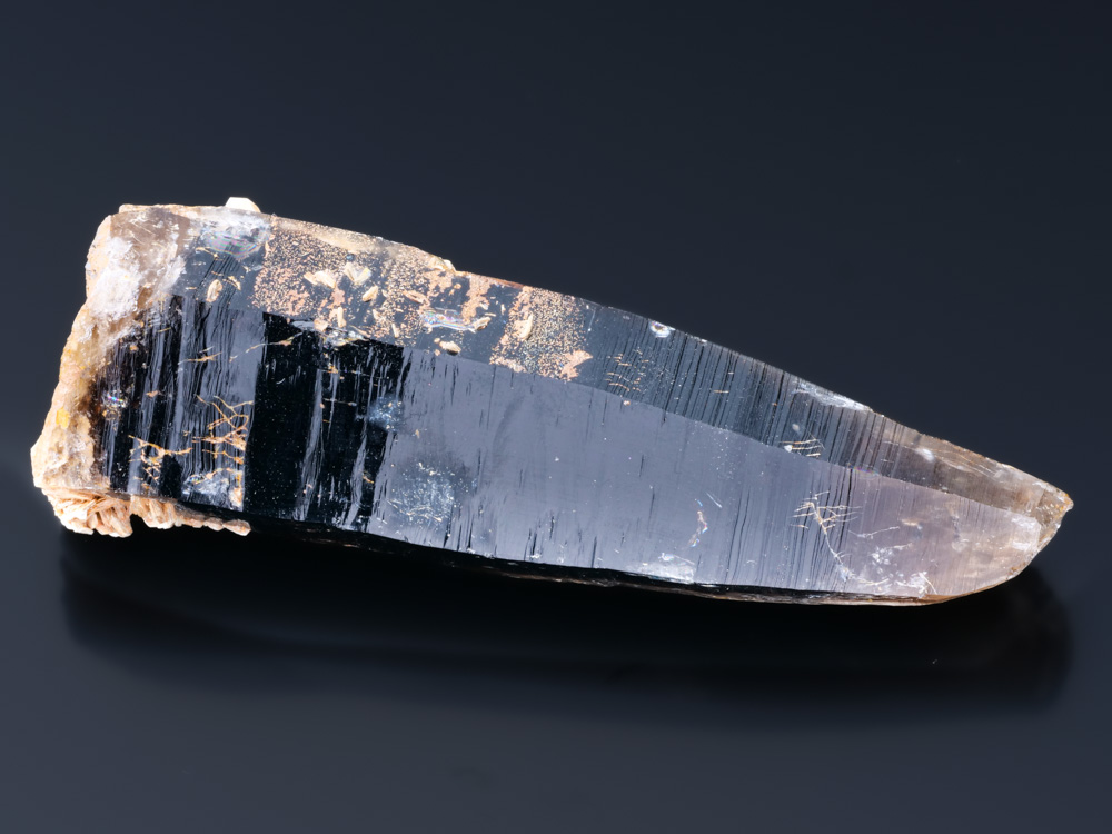 Kónický krystal velmi tmavé záhnědy (ve spodní části až morionu) z lokality Suky v Česke republice.