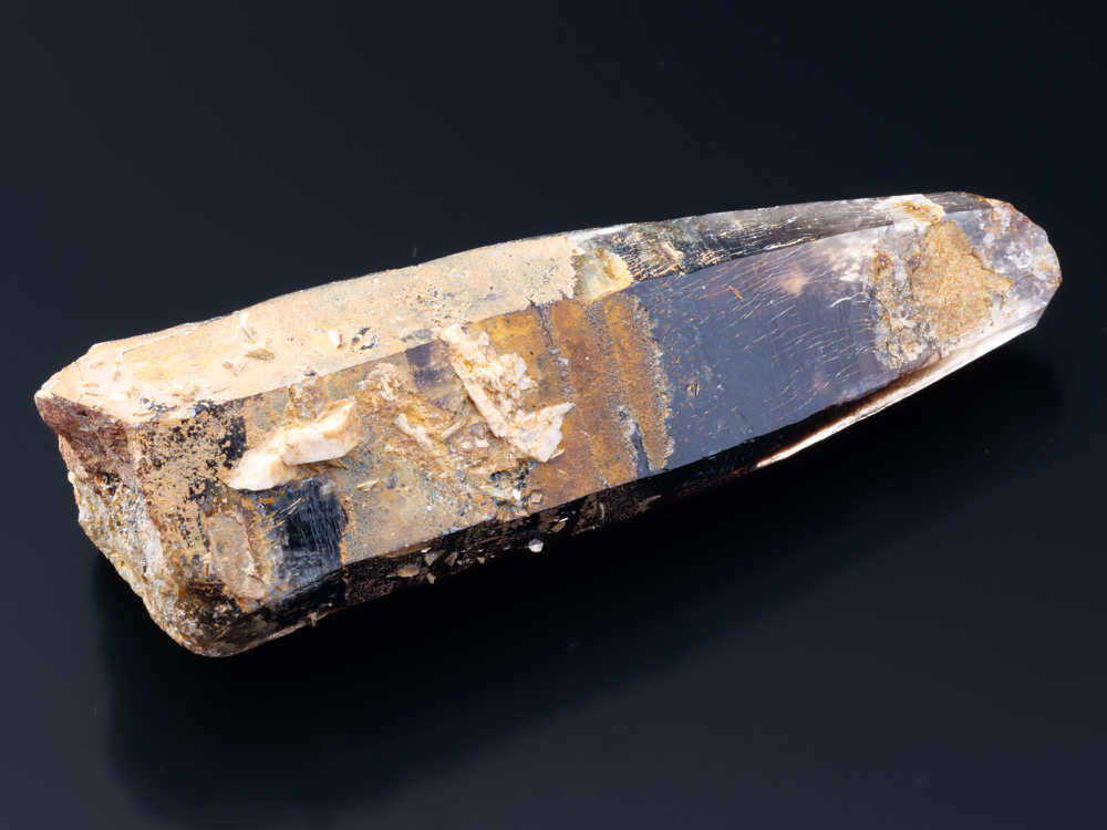 Kónický krystal velmi tmavé záhnědy (ve spodní části až morionu) z lokality Suky v Česke republice. Krystal je lesklý bez ukončení (ukončení nerůstalo nejspíše do boku dutiny a má kromě tří drobných klencových ploch 16x13 mm velkou plochu rekrystalizace střídající se s poškozením). Vzorek obsahuje i slídu a albit.